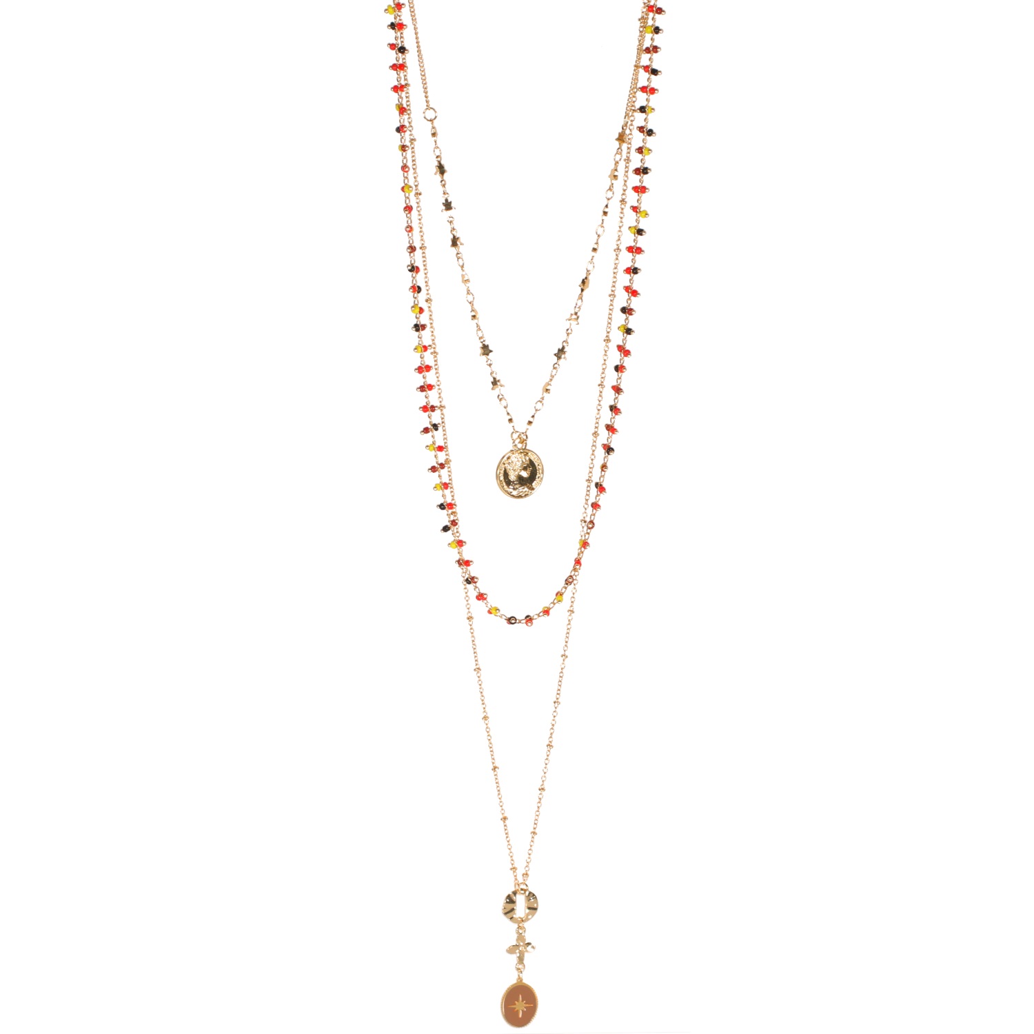 Collier sautoir fantaisie triple rangs avec étoiles et pendentifs en métal doré, émail et perles de couleur.