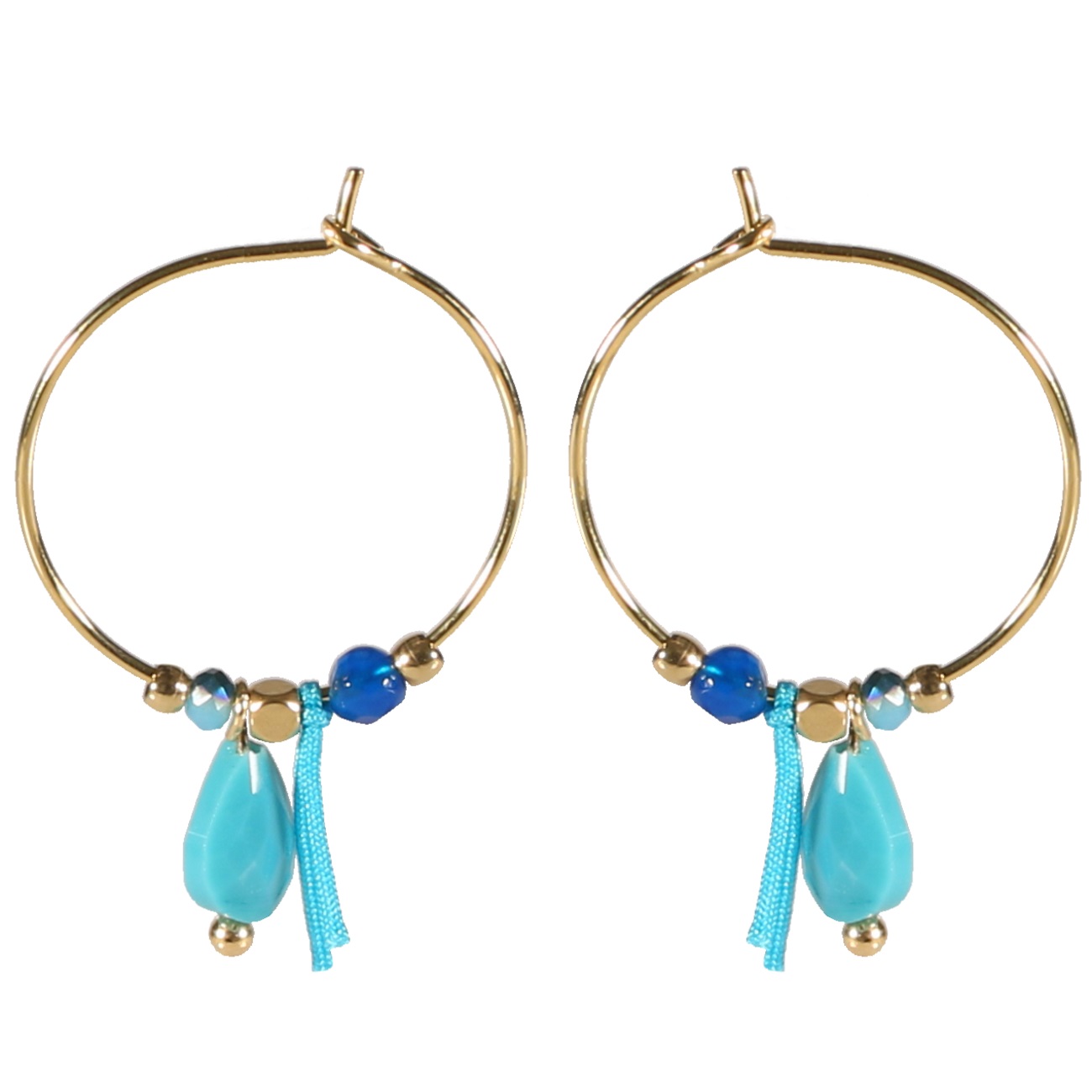 Boucles d'oreilles créoles avec pendants en acier doré, petits cordons en coton et pierres de couleur.
