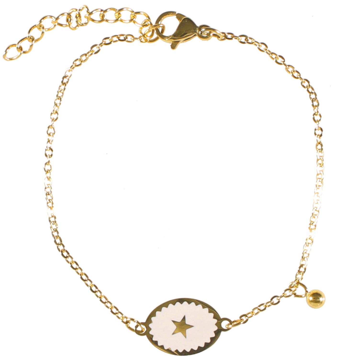 Description Bracelet avec pastille ovale motif étoile et pampille boule en acier doré et émail. Longueur 15.5+2.5 cm [Guide des tailles] Largeur 9 mm Matière(s) Acier , Email . L'acier utilisé dans la bijouterie existe sous plusieurs qualités. Nous utilisons principalement la qualité 316L, qualité qui est utilisée en chirurgie. Cet acier est donc inoxydable et reste très résistant. Fermoir Mousqueton Couleur(s) dominante(s) Blanc , Doré Public Adolescent , Adulte . Genre Femme , Fille . Saison Indémodable . Collection Isabella Cliquez sur une matière, un thème, une couleur ou une collection pour voir tous les articles associés.