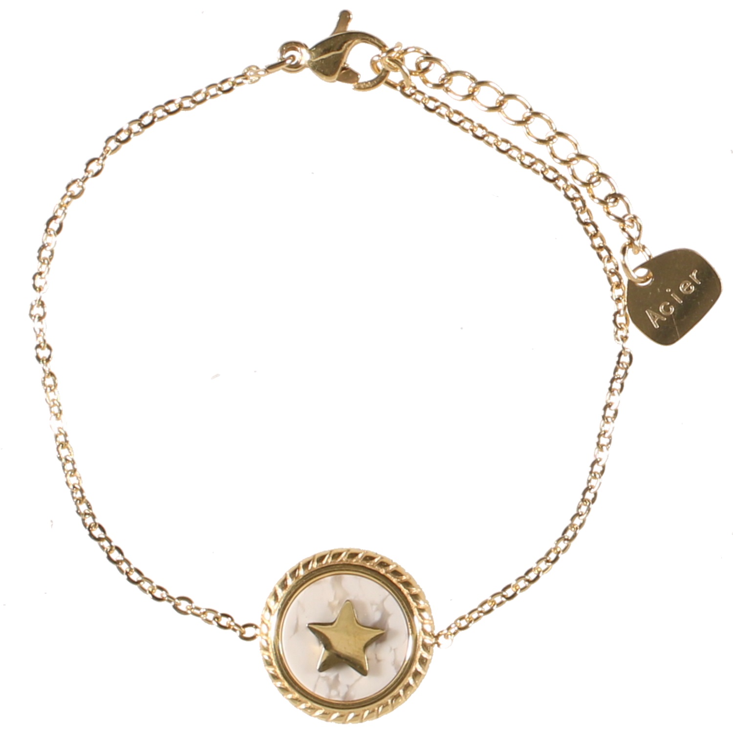 Description Bracelet avec pastille ronde motif étoile en acier doré et pierre de couleur. Longueur 15.5+2.5 cm [Guide des tailles] Largeur 14 mm Matière(s) Acier , Rocaille . L'acier utilisé dans la bijouterie existe sous plusieurs qualités. Nous utilisons principalement la qualité 316L, qualité qui est utilisée en chirurgie. Cet acier est donc inoxydable et reste très résistant. Fermoir Mousqueton Couleur(s) dominante(s) Blanc , Doré Public Adolescent , Adulte . Genre Femme , Fille . Saison Indémodable . Cliquez sur une matière, un thème, une couleur ou une collection pour voir tous les articles associés.