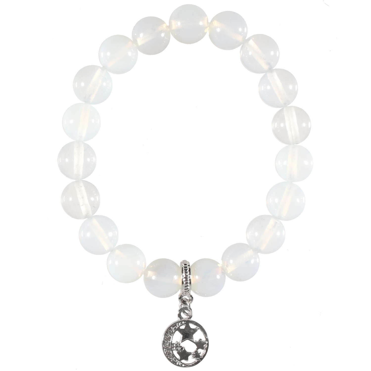 Bracelet élastique avec étoiles en métal argenté et strass et boules en pierre sélénite.