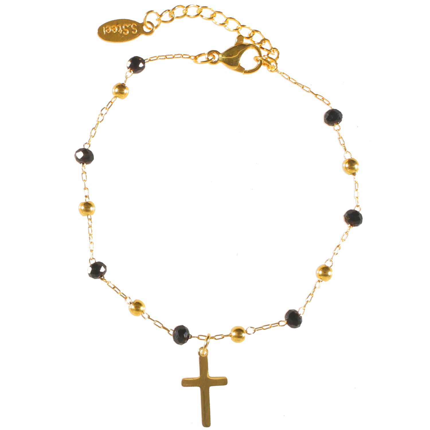 Bracelet avec croix pendante en acier 316L doré et perles de couleur.