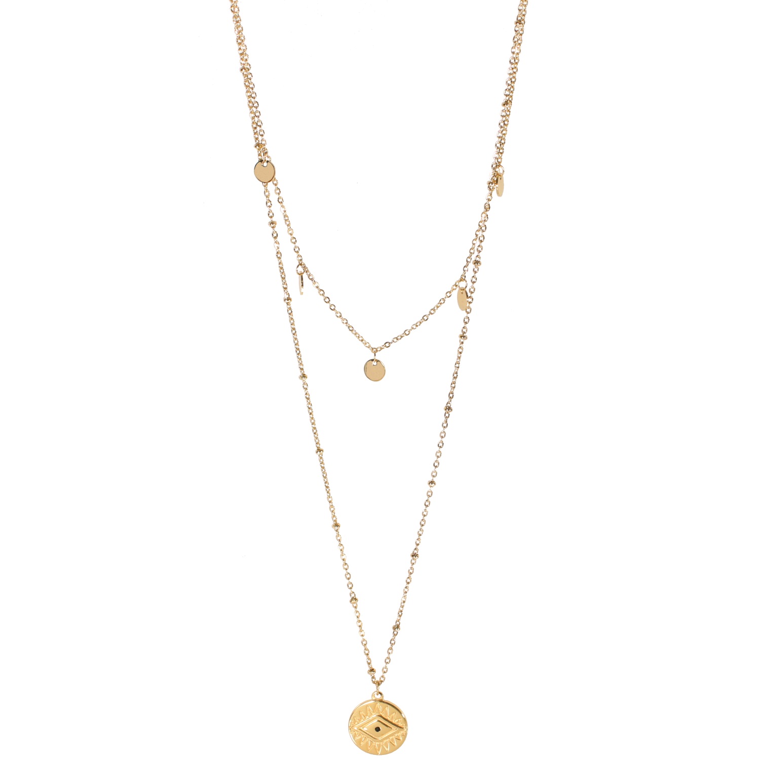 Description Collier double rangs composé d'un collier de 37 cm de long avec pampilles en acier doré ainsi qu'un collier de 52 cm de long avec pendentif motif œil de Turquie en acier doré et un cristal de couleur noire. L'ensemble peut se régler jusqu'à 6 cm de plus. Longueur 37/58+6 cm [Guide des tailles] Matière(s) Acier , Verre . L'acier utilisé dans la bijouterie existe sous plusieurs qualités. Nous utilisons principalement la qualité 316L, qualité qui est utilisée en chirurgie. Cet acier est donc inoxydable et reste très résistant. Fermoir Mousqueton À noter Pendentif oeil 15 mm de diamètre Couleur(s) dominante(s) Doré , Noir Public Adolescent , Adulte . Genre Femme , Fille . Saison Indémodable . Collection Myriade Cliquez sur une matière, un thème, une couleur ou une collection pour voir tous les articles associés.