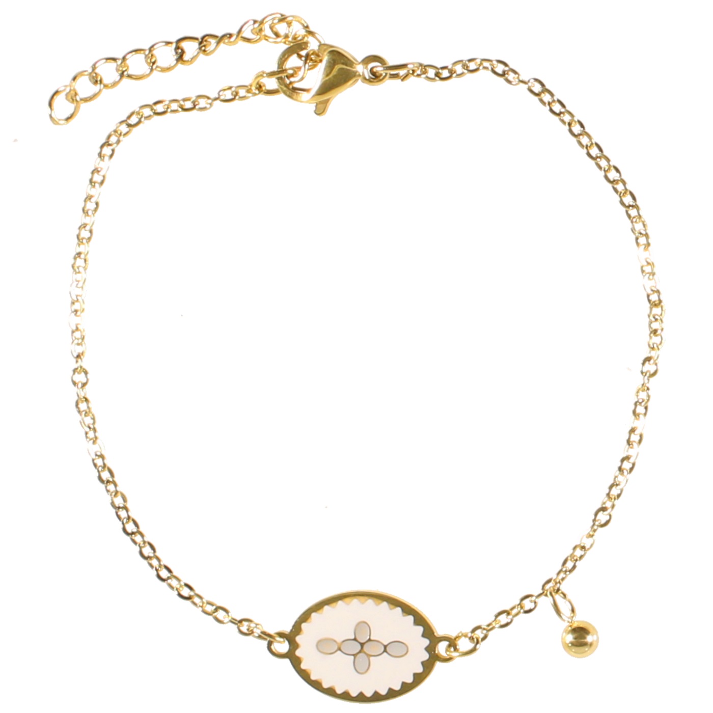 Description Bracelet avec pastille motif croix et pampille en acier doré et émail. Longueur 15+3 cm [Guide des tailles] Largeur 9 mm Matière(s) Acier , Email . L'acier utilisé dans la bijouterie existe sous plusieurs qualités. Nous utilisons principalement la qualité 316L, qualité qui est utilisée en chirurgie. Cet acier est donc inoxydable et reste très résistant. Fermoir Mousqueton Couleur(s) dominante(s) Blanc , Doré Public Adolescent , Adulte . Genre Femme , Fille . Saison Indémodable . Collection Isabella Cliquez sur une matière, un thème, une couleur ou une collection pour voir tous les articles associés.