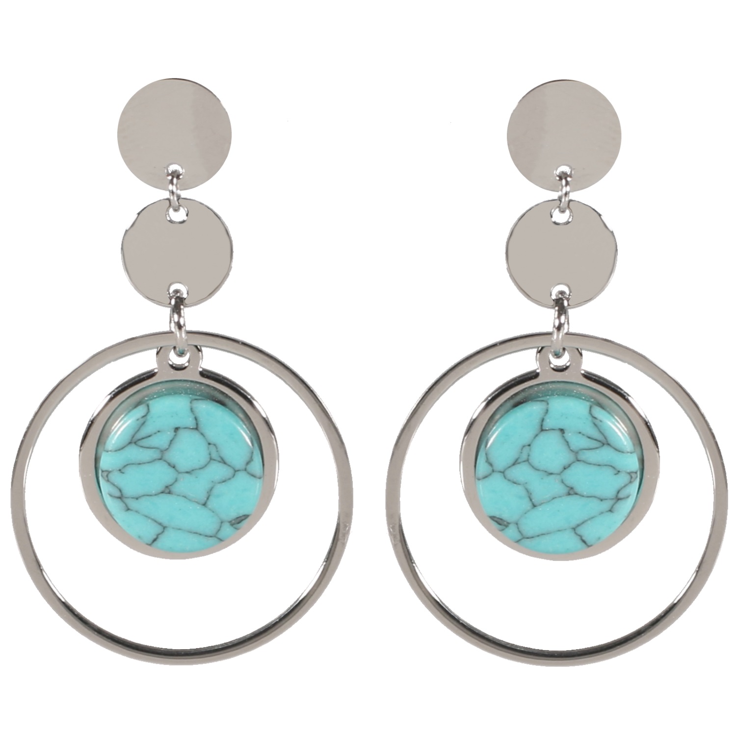 Description Boucles d'oreilles pendantes avec cercle en acier 316L argenté et pastille ronde en pierre d'imitation turquoise. Largeur 25 mm Hauteur 42 mm Matière(s) Acier , Rocaille . L'acier utilisé dans la bijouterie existe sous plusieurs qualités. Nous utilisons principalement la qualité 316L, qualité qui est utilisée en chirurgie. Cet acier est donc inoxydable et reste très résistant. Fermoir Tiges poussettes Couleur(s) dominante(s) Argenté , Bleu Public Adolescent , Adulte . Genre Femme , Fille . Saison Indémodable . Cliquez sur une matière, un thème, une couleur ou une collection pour voir tous les articles associés.