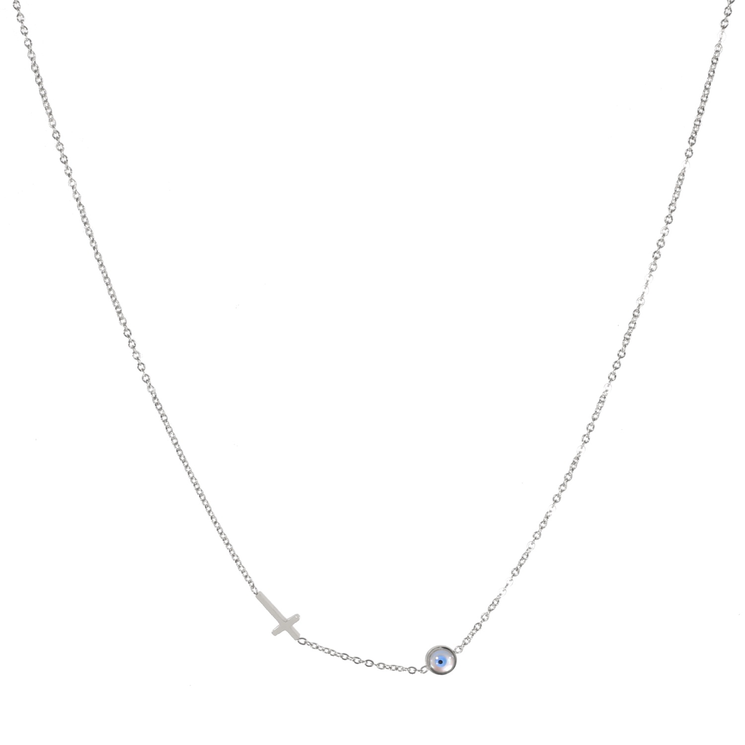 Collier avec croix en acier argenté et œil de Turquie en nacre et émail.