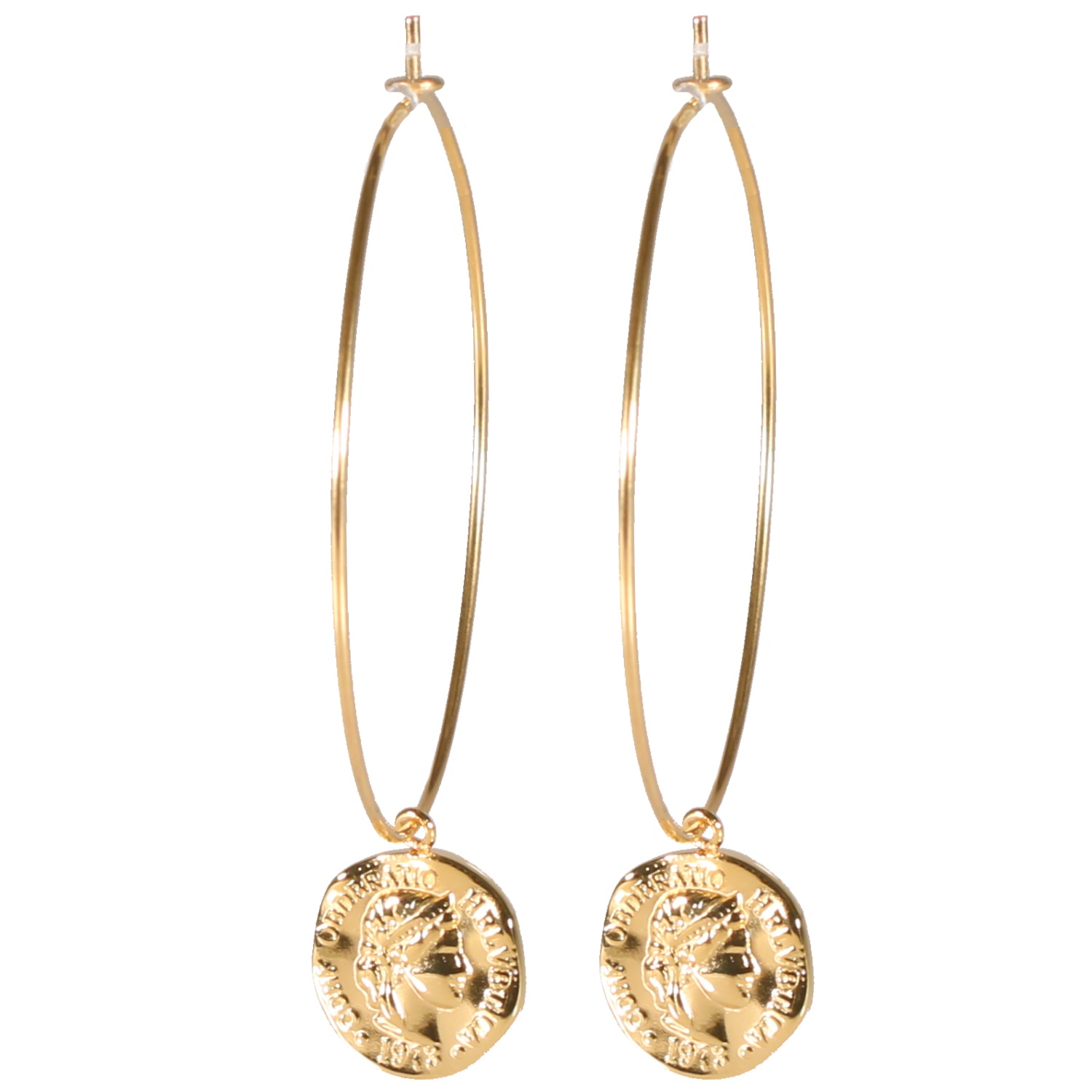 Boucles d'oreilles créoles avec pastilles motif pièce de monnaie de la confédération helvétique (Suisse) en acier doré.