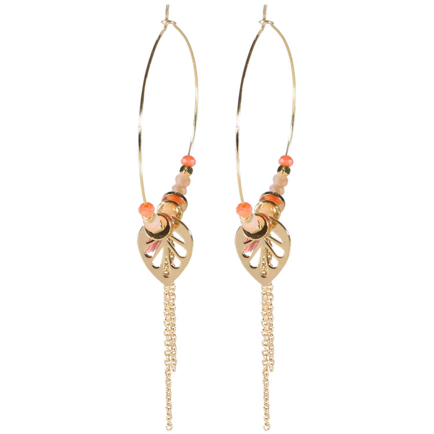 Boucles d'oreilles créoles avec feuilles et chaînettes pendantes en acier doré, perles de couleur et pompon en textile.