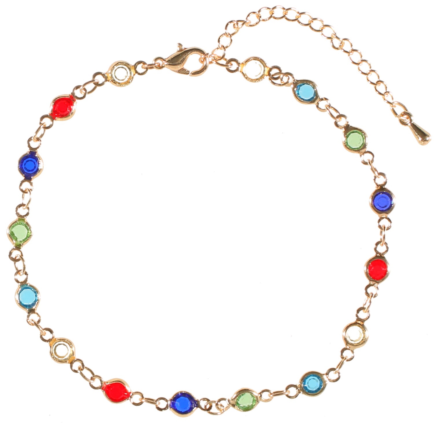 Bracelet chaîne de cheville fantaisie en métal doré et cristaux de couleur.