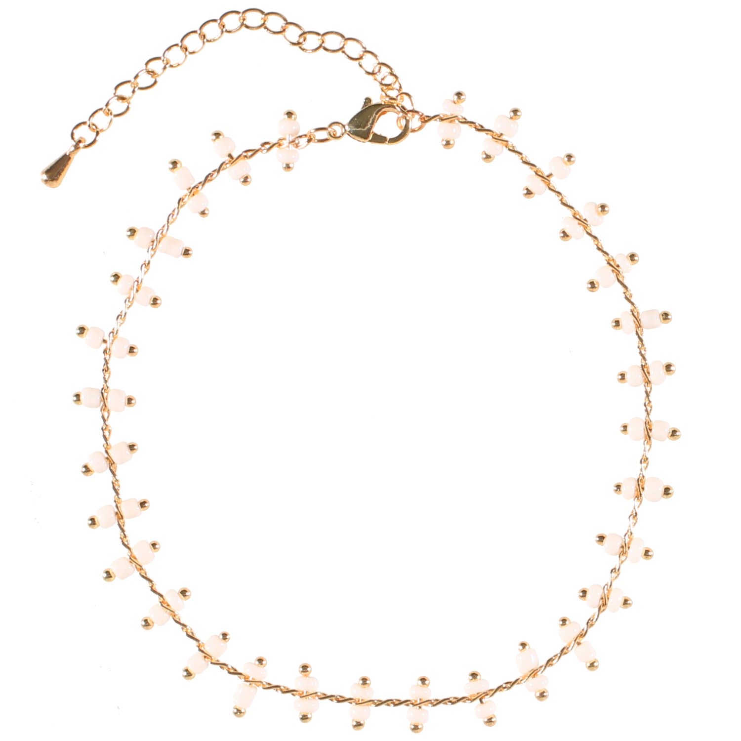 Bracelet chaîne de cheville fantaisie en métal doré et perles de couleur blanche.