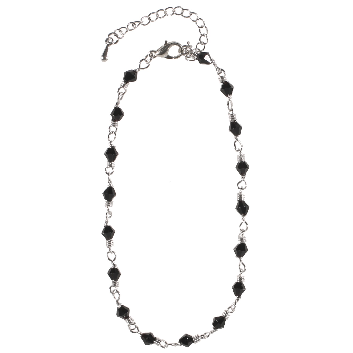 Bracelet chaîne de cheville fantaisie en métal argenté et perles de couleur noire.