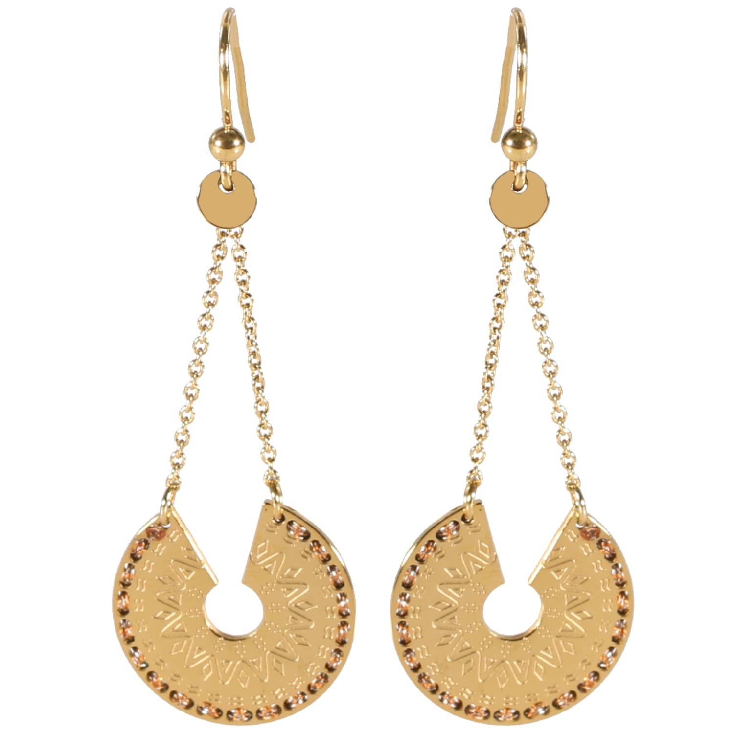Description Boucles d'oreilles pendantes en acier doré. Largeur 17 mm Hauteur 50 mm Matière(s) Acier . L'acier utilisé dans la bijouterie existe sous plusieurs qualités. Nous utilisons principalement la qualité 316L, qualité qui est utilisée en chirurgie. Cet acier est donc inoxydable et reste très résistant. Fermoir Crochets Couleur(s) dominante(s) Doré Public Adolescent , Adulte . Genre Femme , Fille . Saison Indémodable . Collection Royale inca Cliquez sur une matière, un thème, une couleur ou une collection pour voir tous les articles associés.