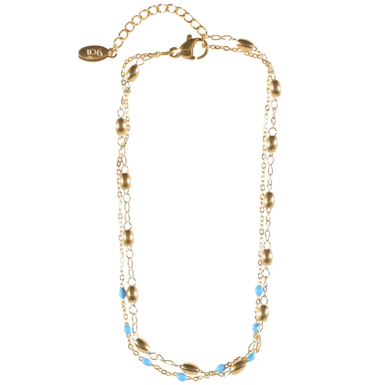 Description Bracelet chaîne de cheville double rangs en acier doré et perles en émail. Longueur 21+3 cm [Guide des tailles] Largeur 4 mm Matière(s) Acier , Email . L'acier utilisé dans la bijouterie existe sous plusieurs qualités. Nous utilisons principalement la qualité 316L, qualité qui est utilisée en chirurgie. Cet acier est donc inoxydable et reste très résistant. Fermoir Mousqueton Couleur(s) dominante(s) Bleu , Doré Public Adolescent , Adulte . Genre Femme , Fille . Saison Eté . Collection Zeste d'été Cliquez sur une matière, un thème, une couleur ou une collection pour voir tous les articles associés.