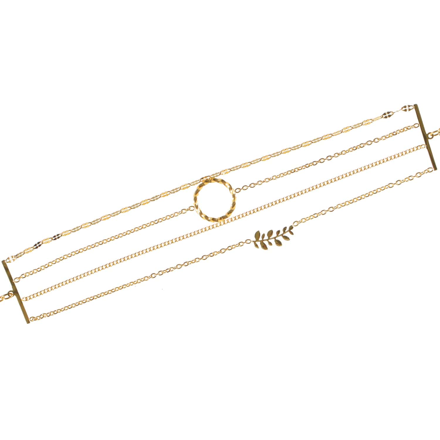 Description Bracelet quatre rangs avec feuilles de laurier et cercle en acier doré. Cliquez sur une matière, un thème, une couleur ou une collection pour voir tous les articles associés.