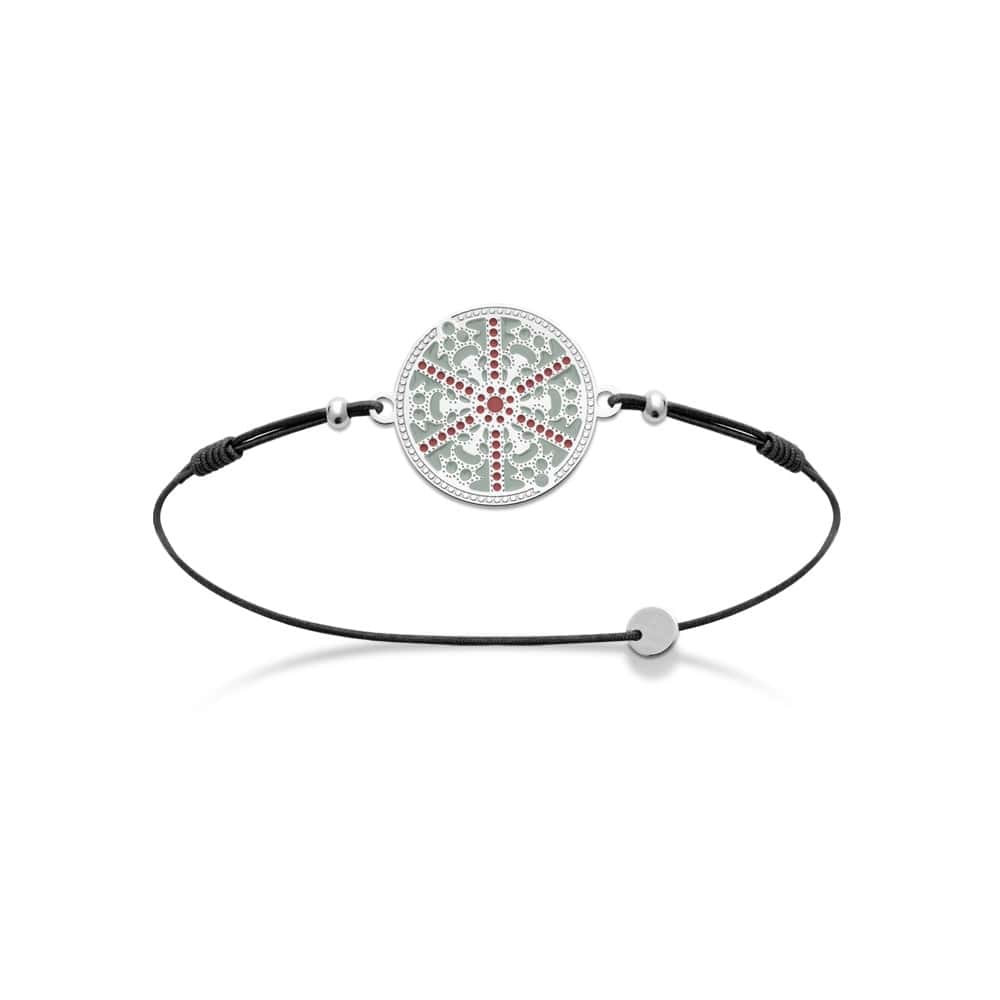 Bracelet avec cordon élastique en coton et pastille en argent 925/000 rhodié avec motif en émail.