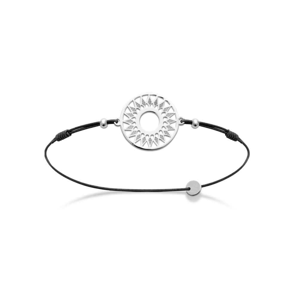 Bracelet avec cordon élastique en coton et pastille ajourée en argent 925/000 rhodié.