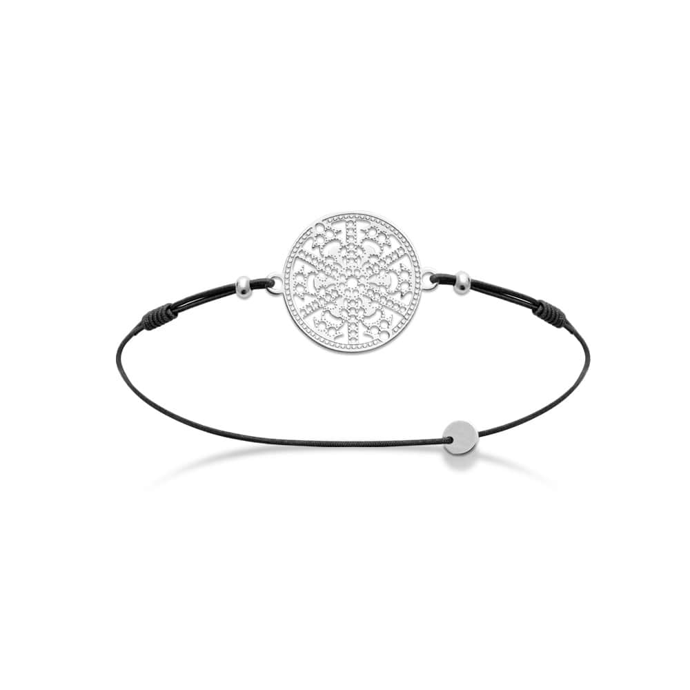 Bracelet avec cordon élastique en coton et pastille ajourée en argent 925/000 rhodié.