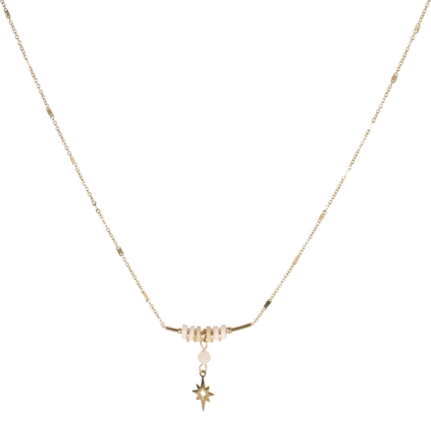 Collier avec pendentif étoile en acier doré, rondelles de caoutchouc et perle de couleur.