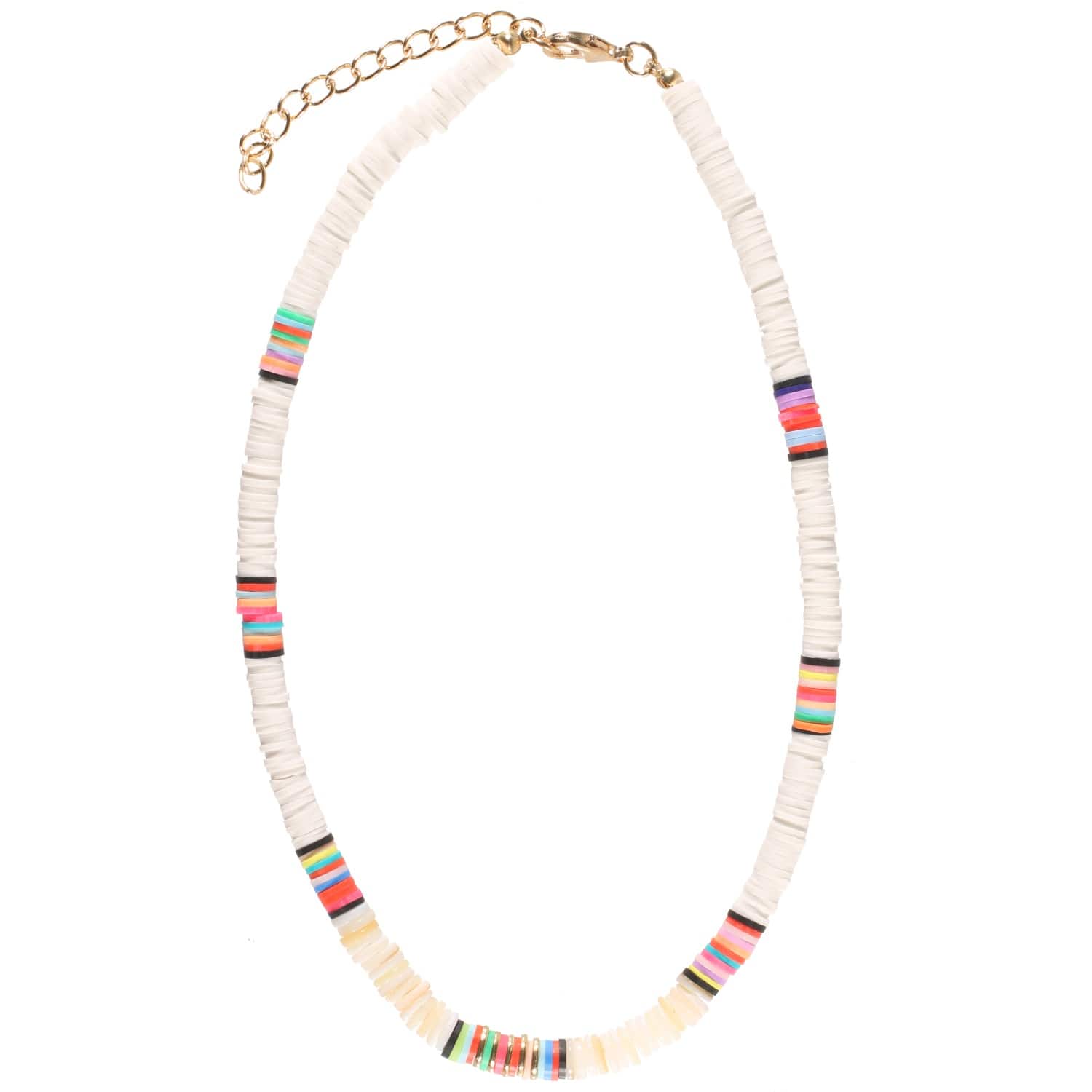 Collier fantaisie en métal doré, perles rondelles de nacre et perles rondelles heishi en résine synthétique de couleur acidulée.