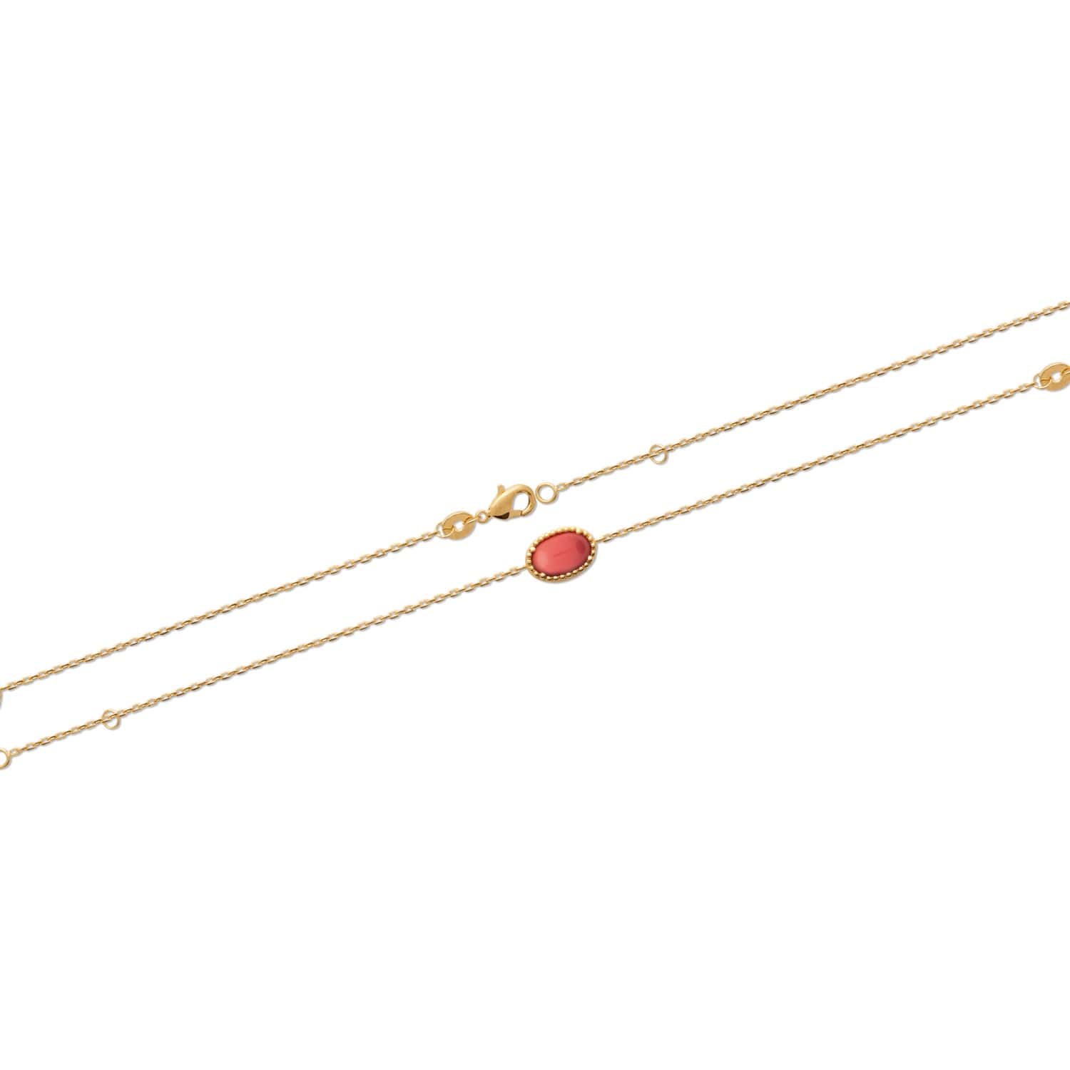 Description Bracelet en plaqué or 18 carats et pierre synthétique de couleur rouge corail de forme ovale sertie 4 griffes.Fermoir mousqueton avec anneaux de rappel à 16 et 18 cm. Longueur 16/18 cm [Guide des tailles] Largeur 8 mm Matière(s) Pierre synthétique , Plaqué or . Nos bijoux en plaqué or sont faits sur une base de laiton et recouverts d'or 18 carats à 3 microns sans dispersion. Cela signifie que nous garantissons 3 microns d'or sur n'importe quelle partie du bijou. Sur la plupart de nos bijoux empierrés, nous montons à 5 microns d'or 18 carats. Pour finir, nous faisons également une finition avec de l'or 24 carats afin de donner un plus bel éclat à nos bijoux. Fermoir Mousqueton Couleur(s) dominante(s) Doré , Rouge Public Adolescent , Adulte . Genre Femme , Fille . Saison Indémodable . Collection Bien-être Cliquez sur une matière, un thème, une couleur ou une collection pour voir tous les articles associés.
