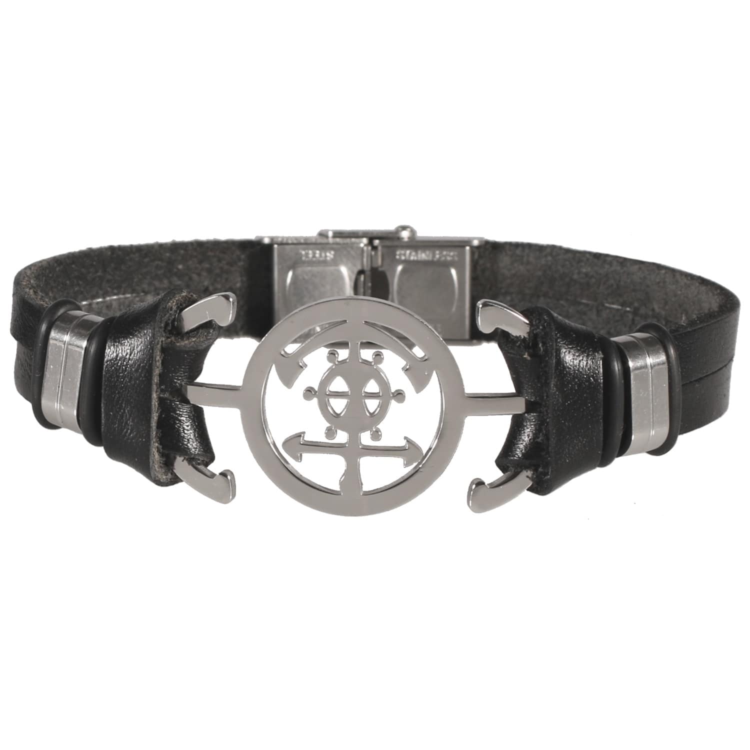 Bracelet pour hommes double rangs avec symbole rond d'une ancre et d'un gouvernail en acier argenté et en cuir.