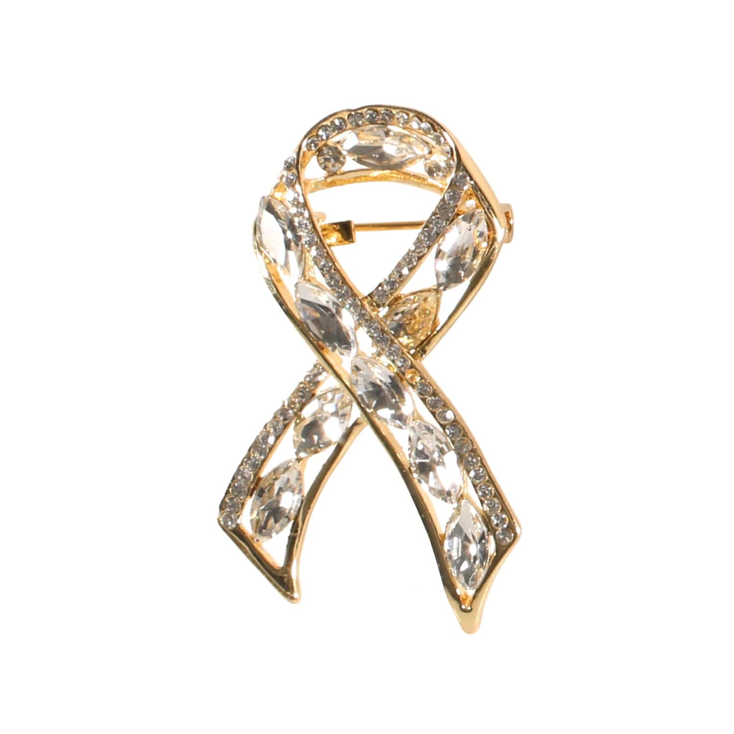 Broche fantaisie ruban symbolisant le signe infini coupé (symbole de la lutte contre le sida) en métal doré, cristaux et strass en verre.