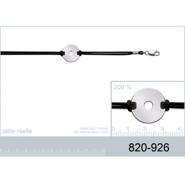 Bracelet en argent 925/000, cordon ciré et médaillon en argent 925/000.