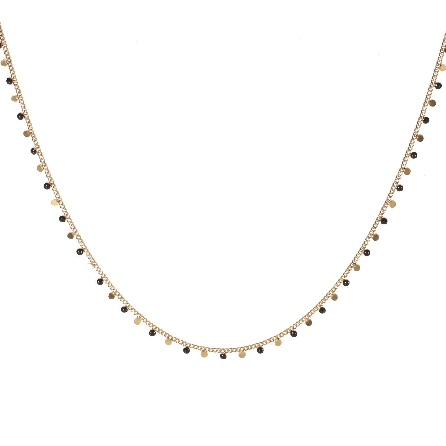 Description collier avec pampilles en acier doré et émail. Fermoir mousqueton avec 4.5 cm de rallonge. Cliquez sur une matière, un thème, une couleur ou une collection pour voir tous les articles associés.