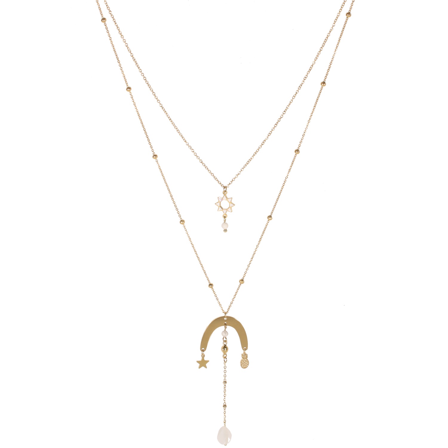 collier sautoir double rangs composé d'un collier de 41 cm de long avec pendentif étoile en acier doré et émail et une perle de couleur ainsi qu'un collier de 50 cm de long avec pendentifs étoile et ananas en acier doré et pierre de couleur.