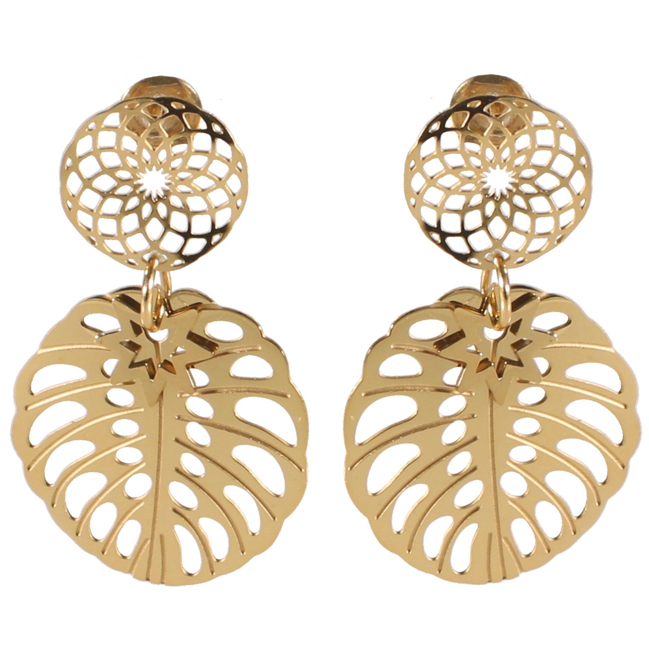 Description Boucles d'oreilles pendantes rosaces, étoile et feuilles de philodendron en acier doré. Largeur 22 mm Hauteur 37 mm Matière(s) Acier . L'acier utilisé dans la bijouterie existe sous plusieurs qualités. Nous utilisons principalement la qualité 316L, qualité qui est utilisée en chirurgie. Cet acier est donc inoxydable et reste très résistant. Fermoir Tiges poussettes Couleur(s) dominante(s) Blanc , Doré Public Adolescent , Adulte . Genre Femme , Fille . Saison Indémodable . Thème(s) Nature . Collection Jungle exotique Cliquez sur une matière, un thème, une couleur ou une collection pour voir tous les articles associés.