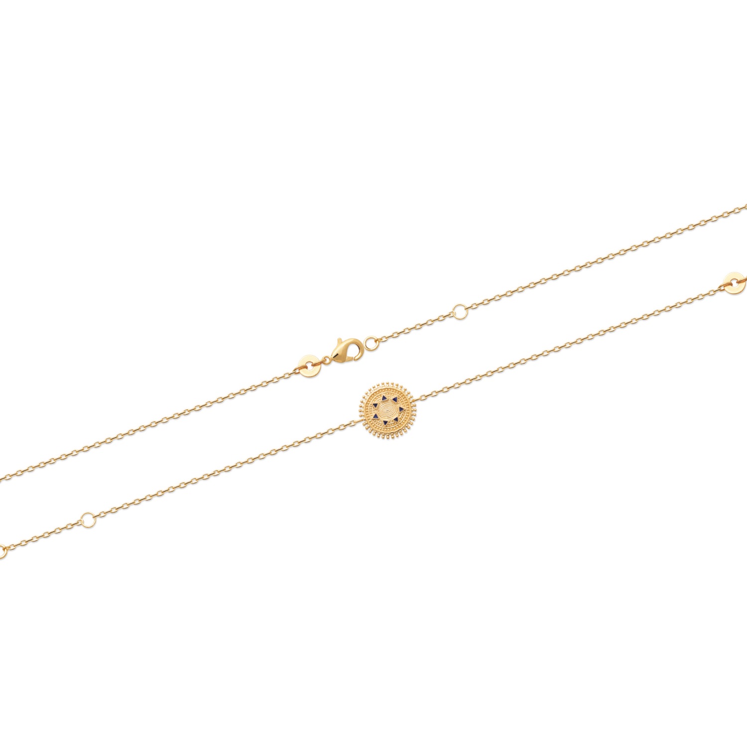Bracelet surmonté d'un médaillon avec contours en dents et motifs en relief en plaqué or 18 carats et émail de couleur noire.<br/>Fermoir mousqueton avec anneaux de rappel à 16 et 18 cm pour l'adapter à votre envie. Rond Soleil  Adolescent Adulte Femme Fille Indémodable Nature