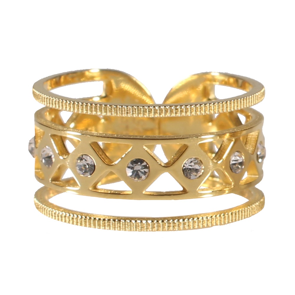 Description Bague triple rangs en acier 316L doré au motifs de losanges surmontés de cristaux en verre. Taille ajustable. Largeur 10 mm Matière(s) Acier , Verre . L'acier utilisé dans la bijouterie existe sous plusieurs qualités. Nous utilisons principalement la qualité 316L, qualité qui est utilisée en chirurgie. Cet acier est donc inoxydable et reste très résistant. Fermoir Aucun Couleur(s) dominante(s) Doré Public Adolescent , Adulte . Genre Femme , Fille . Saison Indémodable . Cliquez sur une matière, un thème, une couleur ou une collection pour voir tous les articles associés.
