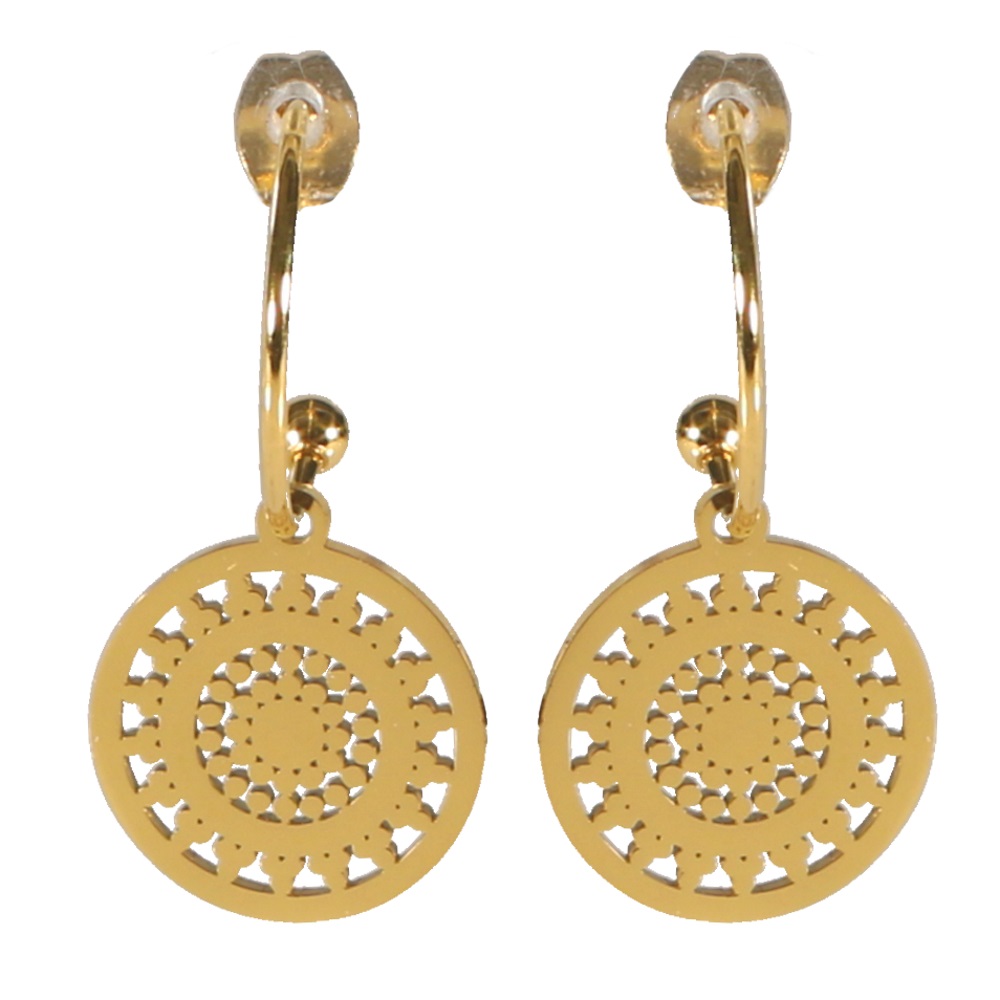 Description Boucles d'oreilles créoles ouvertes avec pastille ronde aux motifs ajourés en acier doré. Largeur 15 mm Hauteur 30 mm Diamètre 15 mm Matière(s) Acier . L'acier utilisé dans la bijouterie existe sous plusieurs qualités. Nous utilisons principalement la qualité 316L, qualité qui est utilisée en chirurgie. Cet acier est donc inoxydable et reste très résistant. Fermoir Tiges poussettes Couleur(s) dominante(s) Doré Public Adolescent , Adulte . Genre Femme , Fille . Saison Indémodable . Cliquez sur une matière, un thème, une couleur ou une collection pour voir tous les articles associés.