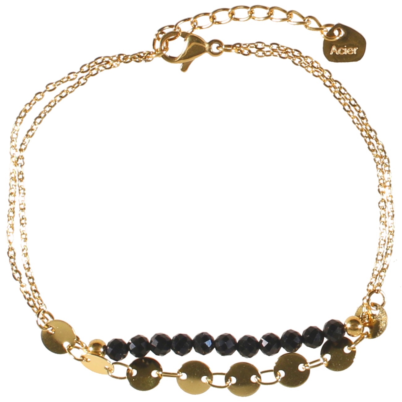 Bracelet double rangs composé d'une chaîne avec petites pastilles rondes en acier doré et d'une chaîne en acier doré et perles pendantes en véritable pierre d'agate noire.