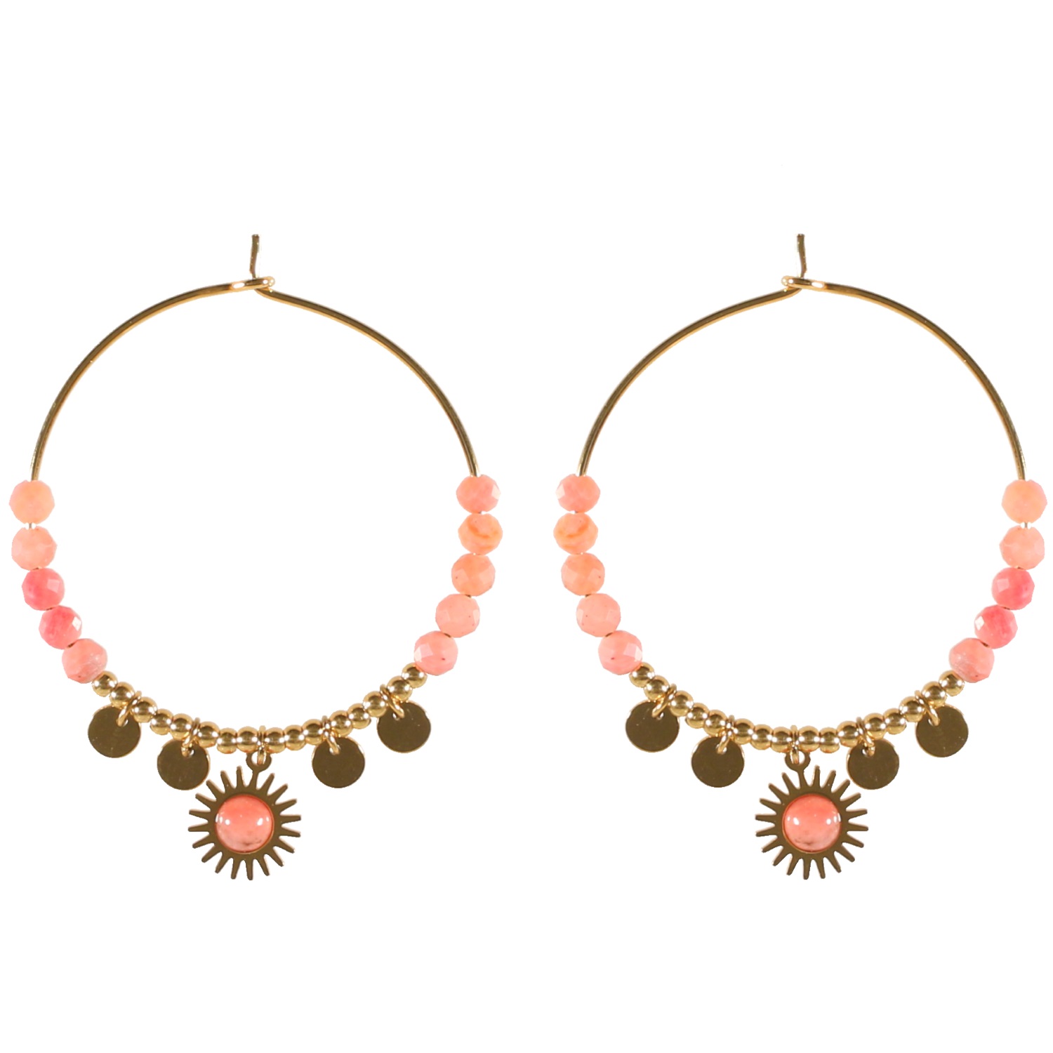 Boucles d'oreilles créoles avec pampilles rondes et soleil en acier doré et perles en véritable pierre de rhodonite.