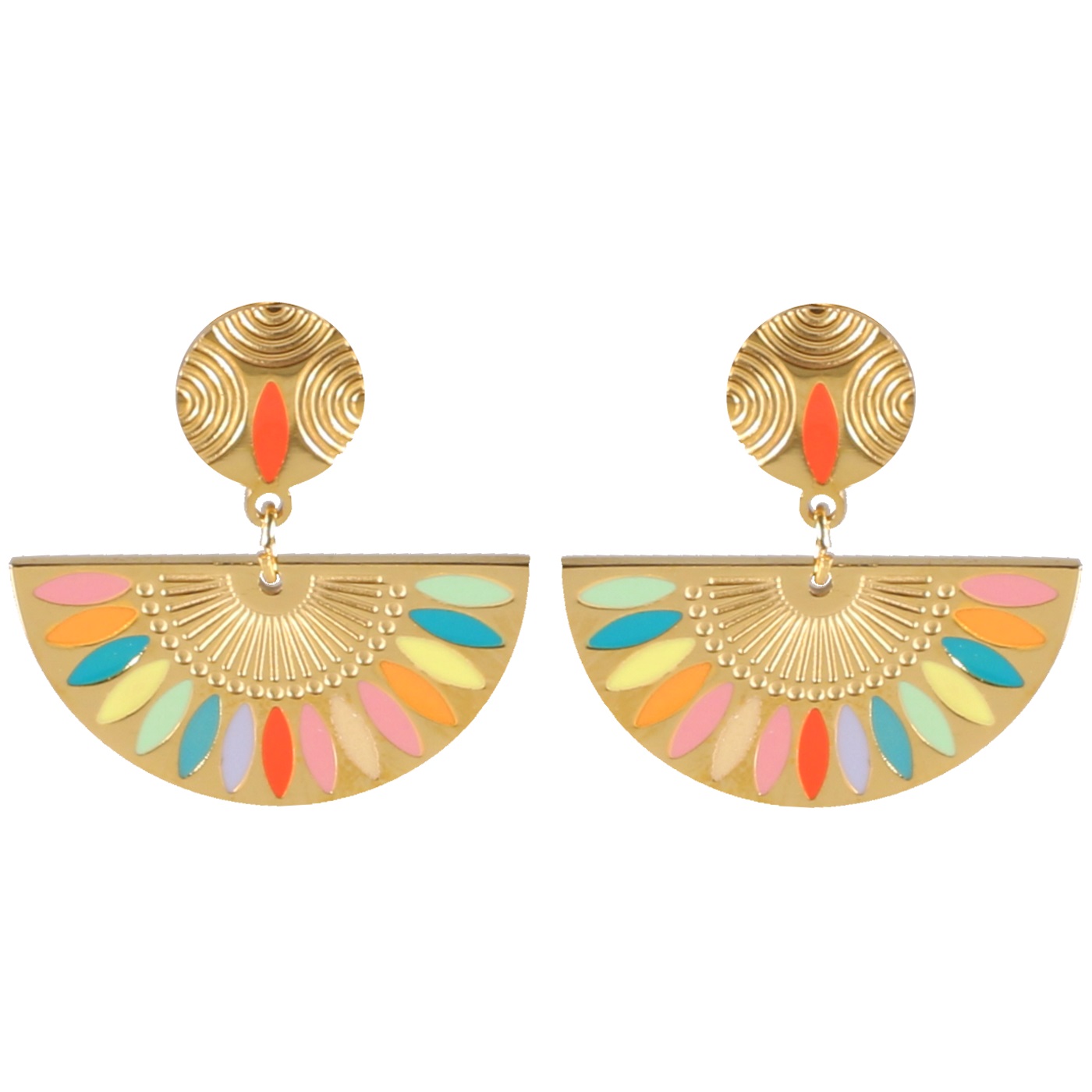Description Boucles d'oreilles pendantes composées de puce ronde et d'un demi rond pendant au motif d'éventail en acier doré et émail de couleur. Largeur 22 mm Hauteur 22 mm Matière(s) Acier , Email . L'acier utilisé dans la bijouterie existe sous plusieurs qualités. Nous utilisons principalement la qualité 316L, qualité qui est utilisée en chirurgie. Cet acier est donc inoxydable et reste très résistant. Fermoir Tiges poussettes Couleur(s) dominante(s) Doré , Multicolore Public Adolescent , Adulte . Genre Femme , Fille . Saison Eté , Printemps . Cliquez sur une matière, un thème, une couleur ou une collection pour voir tous les articles associés.