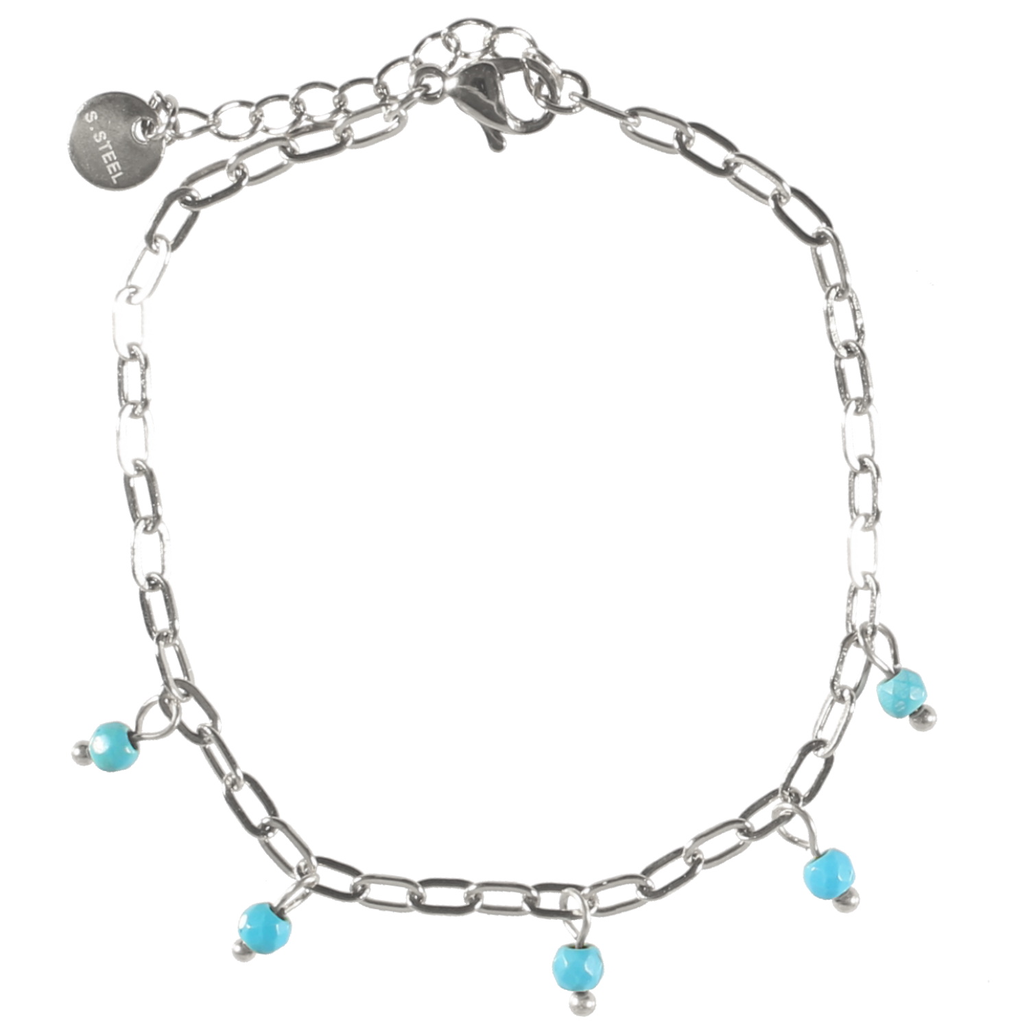 Description Bracelet en acier argenté et perles pendantes de couleur turquoise. Fermoir mousqueton avec 2.5 cm de rallonge. Longueur 15.5+2.5 cm [Guide des tailles] Largeur 7 mm Matière(s) Acier , Rocaille . L'acier utilisé dans la bijouterie existe sous plusieurs qualités. Nous utilisons principalement la qualité 316L, qualité qui est utilisée en chirurgie. Cet acier est donc inoxydable et reste très résistant. Fermoir Mousqueton Couleur(s) dominante(s) Argenté , Bleu Public Adolescent , Adulte . Genre Femme , Fille . Saison Indémodable . Cliquez sur une matière, un thème, une couleur ou une collection pour voir tous les articles associés.