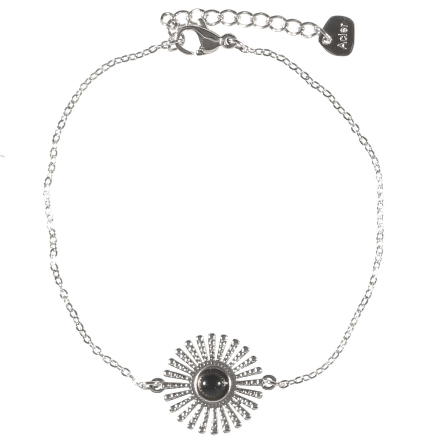 Bracelet composé d'une chaîne en acier argenté et d'une pastille en forme de rayons de soleil en acier argenté surmontée d'une véritable pierre d'agate noire sertie clos.