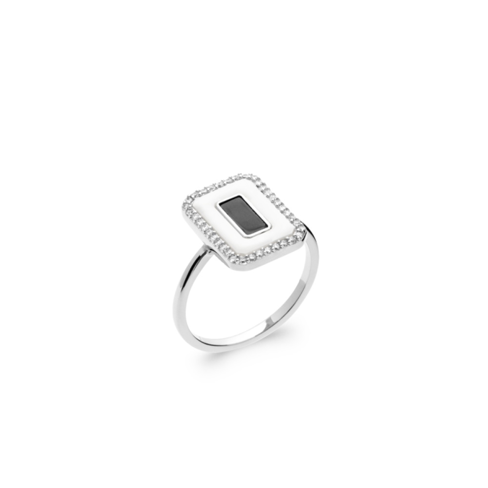 Bague en argent 925/000 rhodié et pastille rectangulaire pavée pour le contour d'oxydes de zirconium blancs et au centre de nacre surmontée d'une véritable pierre d'agate noire sertie clos.<br/>L'agate représente l'équilibre et l'harmonie. Elle est symbole de force et de soutien dans les moments difficiles en recentrant les énergies. Pierre d'ancrage à la terre, elle aide à disperser les énergies négatives et confère stabilité et confiance de soi. Rectangle Strass  Adolescent Adulte Femme Fille Indémodable Bague en argent 925/000 rhodié et pastille rectangulaire pavée pour le contour d'oxydes de zirconium blancs et au centre de nacre surmontée d'une véritable pierre d'agate noire sertie clos.<br/>L'agate représente l'équilibre et l'harmonie. Elle est symbole de force et de soutien dans les moments difficiles en recentrant les énergies. Pierre d'ancrage à la terre, elle aide à disperser les énergies négatives et confère stabilité et confiance de soi. Rectangle Strass  Adolescent Adulte Femme Fille Indémodable