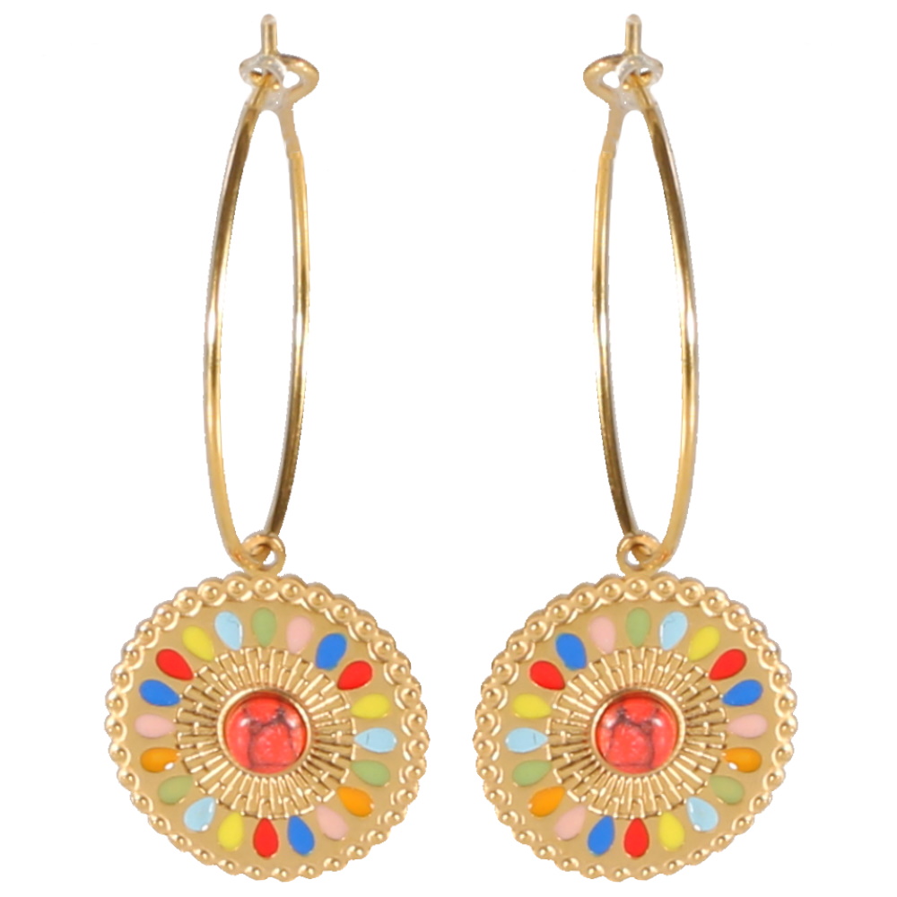 Boucles d'oreilles créoles en acier doré avec pastille pendantes rondes aux motifs en émail multicolore et surmontée d'une pierre de couleur rouge.