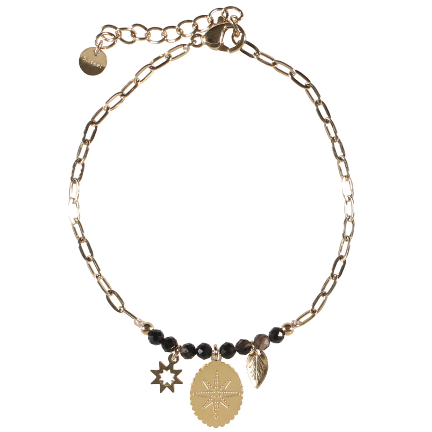 Description Bracelet composé d'une chaîne avec pendants étoile et feuille et pastille ovale avec motif d'étoile en acier doré et perles de couleur noire. Fermoir mousqueton avec 3 cm de rallonge. Longueur 17+3 cm [Guide des tailles] Largeur 14 mm Matière(s) Acier , Rocaille . L'acier utilisé dans la bijouterie existe sous plusieurs qualités. Nous utilisons principalement la qualité 316L, qualité qui est utilisée en chirurgie. Cet acier est donc inoxydable et reste très résistant. Fermoir Mousqueton Couleur(s) dominante(s) Doré , Noir Public Adolescent , Adulte . Genre Femme , Fille . Saison Indémodable . Thème(s) Nature . Cliquez sur une matière, un thème, une couleur ou une collection pour voir tous les articles associés.