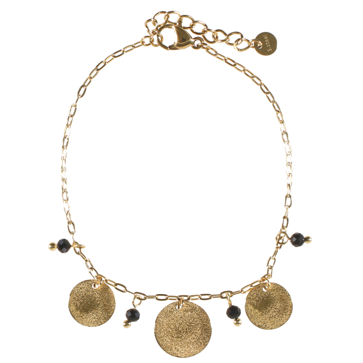 Description Bracelet composé d'une chaîne avec pastilles rondes pendantes en acier doré et pampilles en perles de couleur noire. Fermoir mousqueton avec 3 cm de rallonge. Longueur 17+3 cm [Guide des tailles] Largeur 12 mm Matière(s) Acier , Rocaille . L'acier utilisé dans la bijouterie existe sous plusieurs qualités. Nous utilisons principalement la qualité 316L, qualité qui est utilisée en chirurgie. Cet acier est donc inoxydable et reste très résistant. Fermoir Mousqueton Couleur(s) dominante(s) Doré , Noir Public Adolescent , Adulte . Genre Femme , Fille . Saison Indémodable . Cliquez sur une matière, un thème, une couleur ou une collection pour voir tous les articles associés.