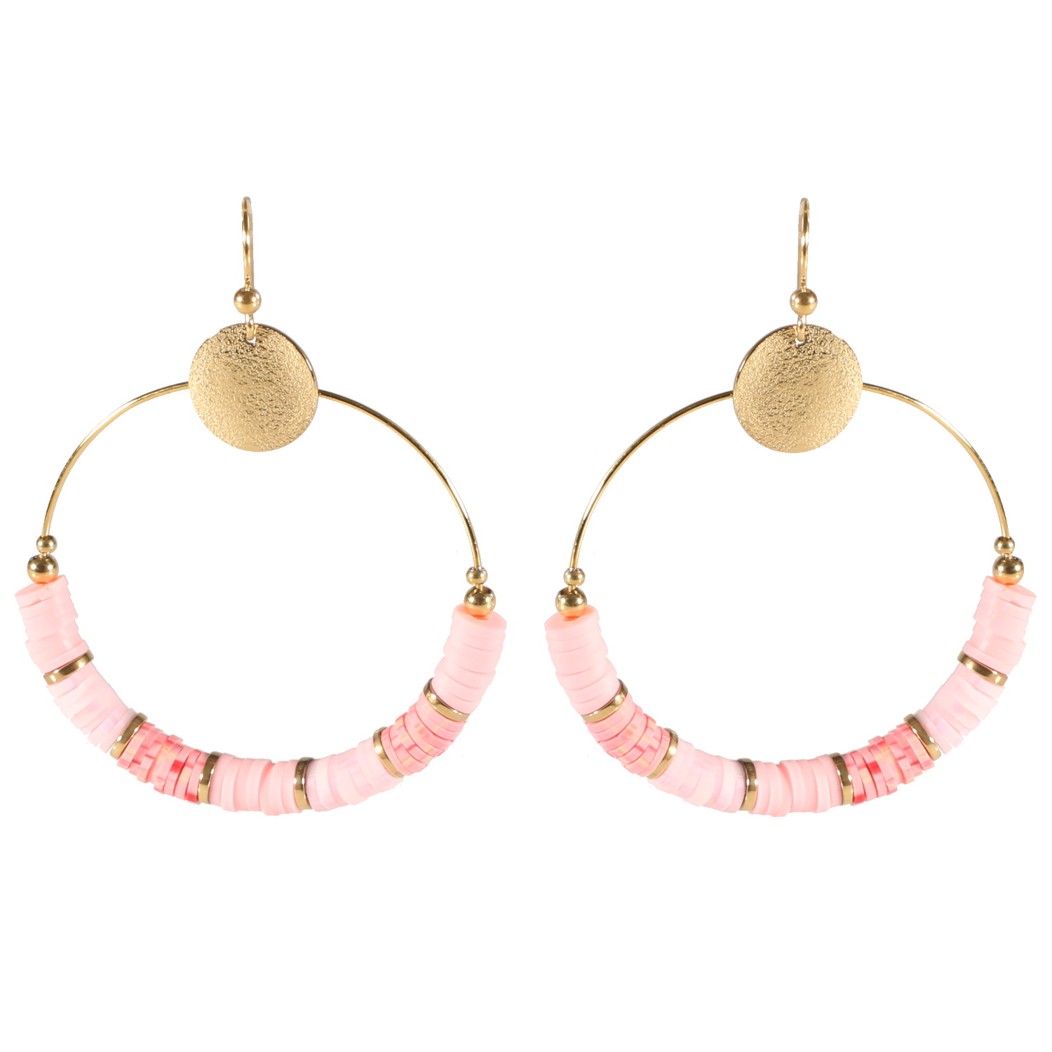 Boucles d'oreilles pendantes composées d'une pastille ronde et d'un cercle en acier doré avec perles cylindriques heishi en résine synthétique et caoutchouc de couleur.