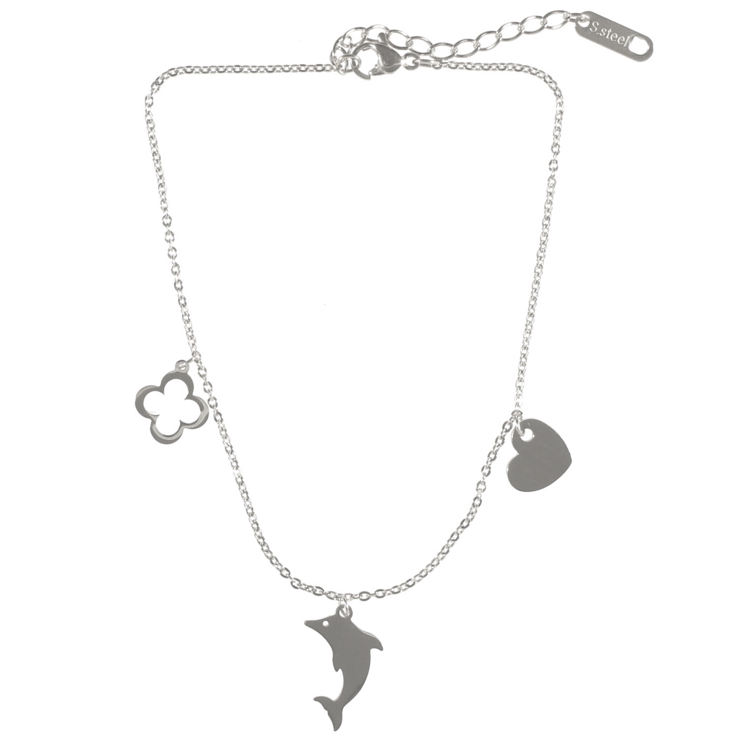 Bracelet chaîne de cheville avec pendants cœur, dauphin et trèfle ajouré en acier argenté.