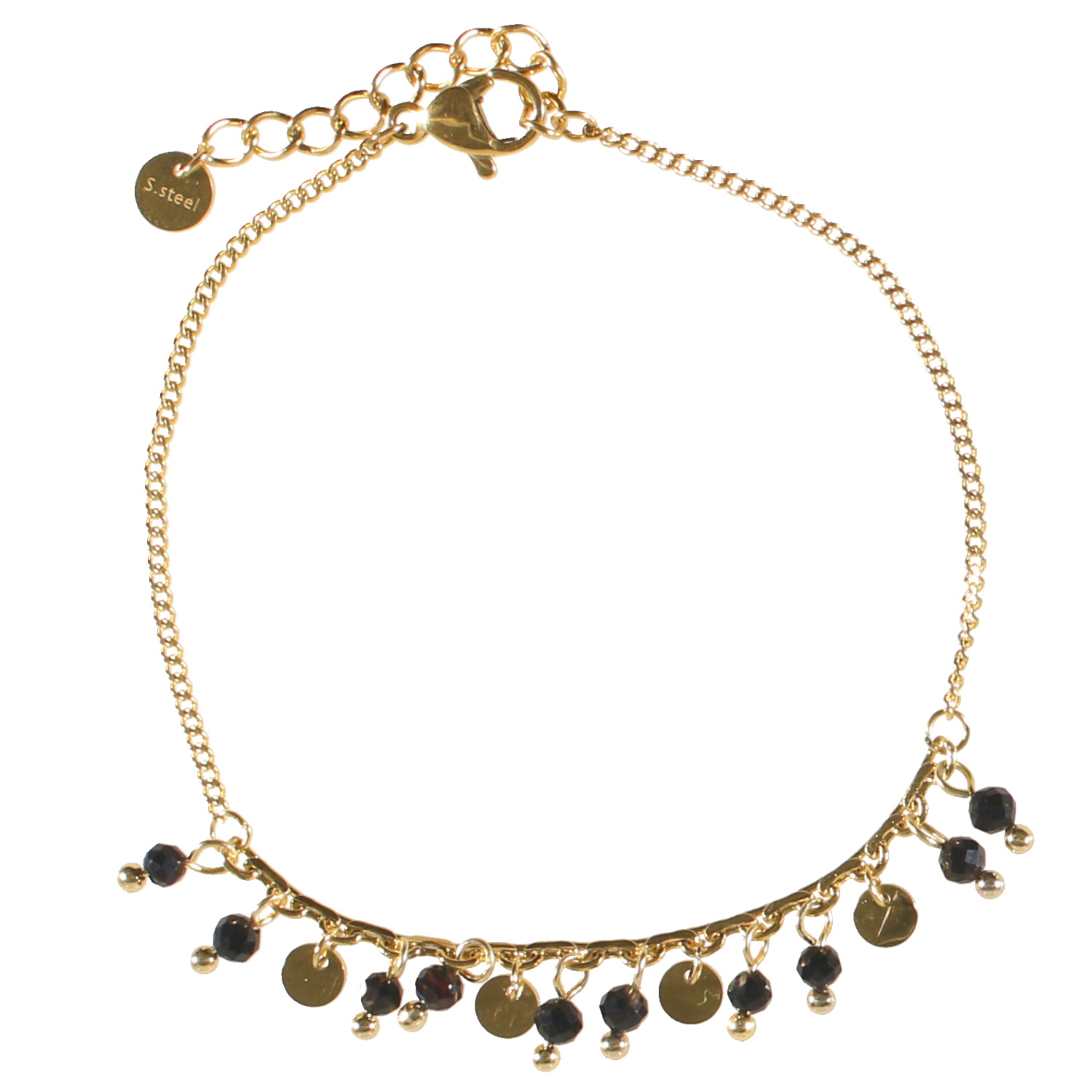 Bracelet composé d'une chaîne avec pampilles rondes en acier doré et pampilles de perles en pierre naturelle d'agate noire.