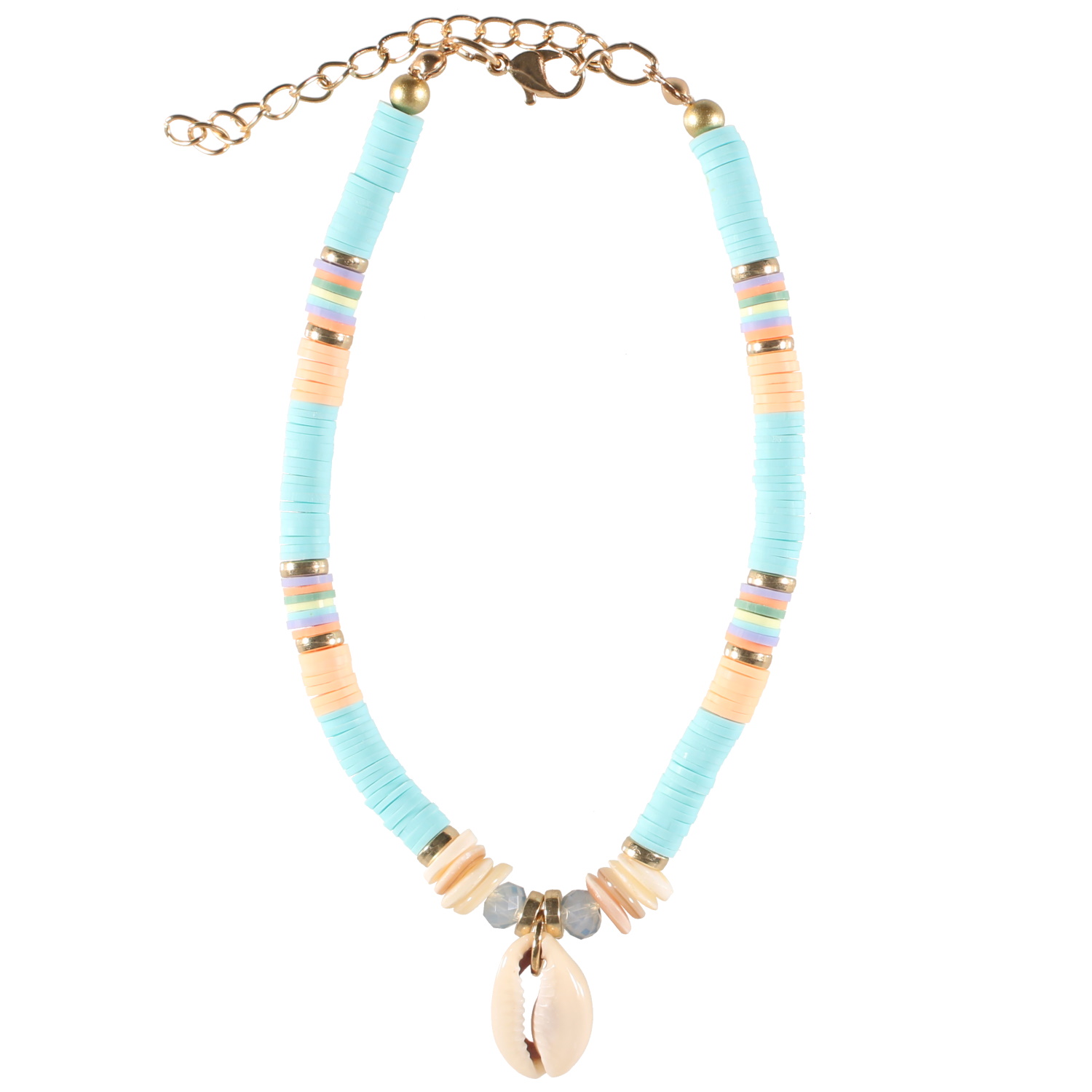 Bracelet chaîne de cheville composé de perles cylindriques heishi en résine synthétique et caoutchouc de couleur acidulée, de perles de nacre, perles de couleur et un véritable coquillage cauri.<br/>Fermoir mousqueton en métal doré avec 6 cm de rallonge. Cheville Coquillage Perle  Adolescent Adulte Eté Femme Fille Nature Bracelet chaîne de cheville composé de perles cylindriques heishi en résine synthétique et caoutchouc de couleur acidulée, de perles de nacre, perles de couleur et un véritable coquillage cauri.<br/>Fermoir mousqueton en métal doré avec 6 cm de rallonge. Cheville Coquillage Perle  Adolescent Adulte Eté Femme Fille Nature