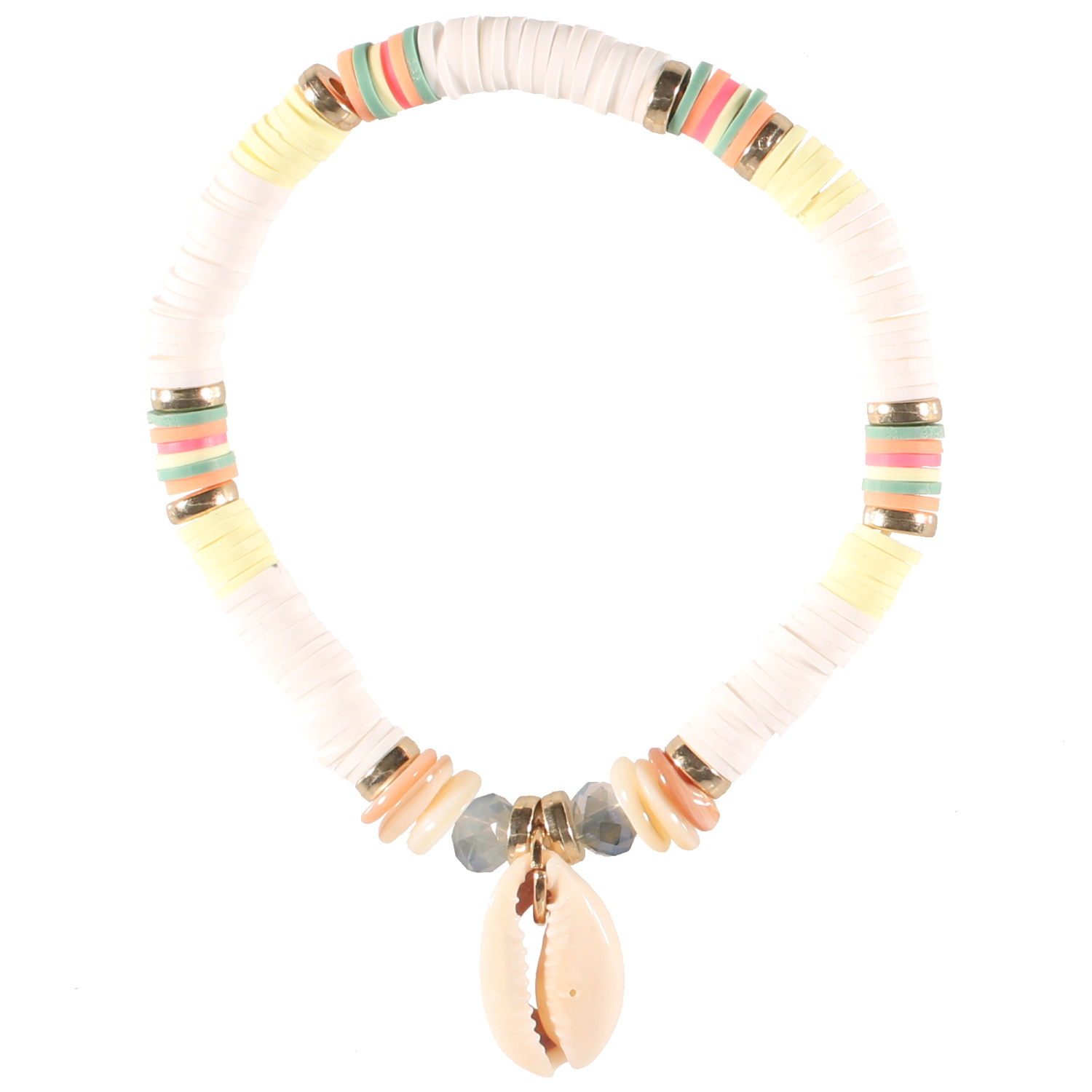 Bracelet élastique composé de perles cylindriques heishi en résine synthétique et caoutchouc de couleur acidulée, de perles de nacre, perles de couleur et un véritable coquillage cauri.