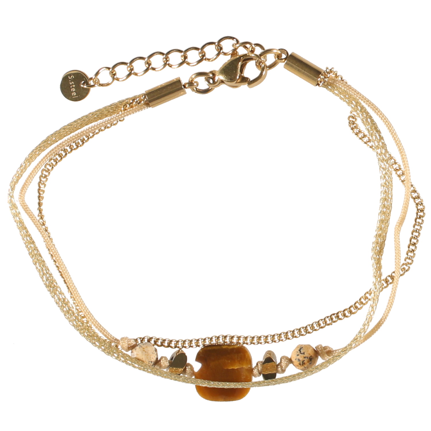 Bracelet triple rangs composé d'une chaîne en acier doré, un cordon en textile doré, ainsi qu'un cordon en coton avec pierres de couleur.