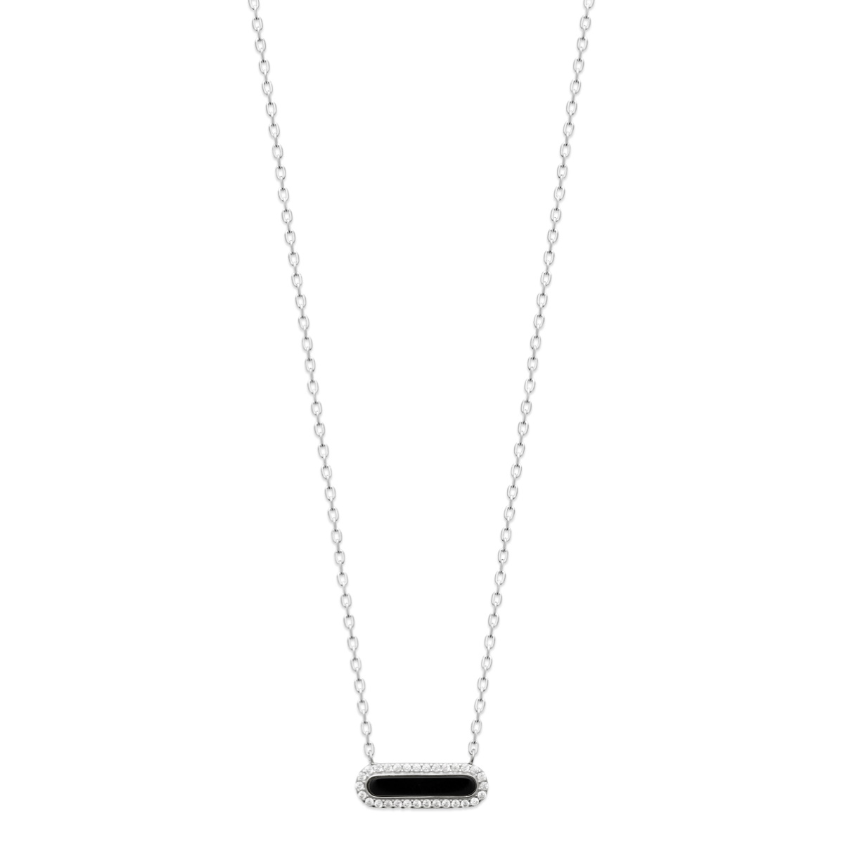 Collier composé d'une chaîne en argent 925/000 rhodié et d'un pendentif pastille rectangulaire arrondie pavée d'une barre de véritable pierre d'agate noire entourée d'un pavage d'oxydes de zirconium blancs.