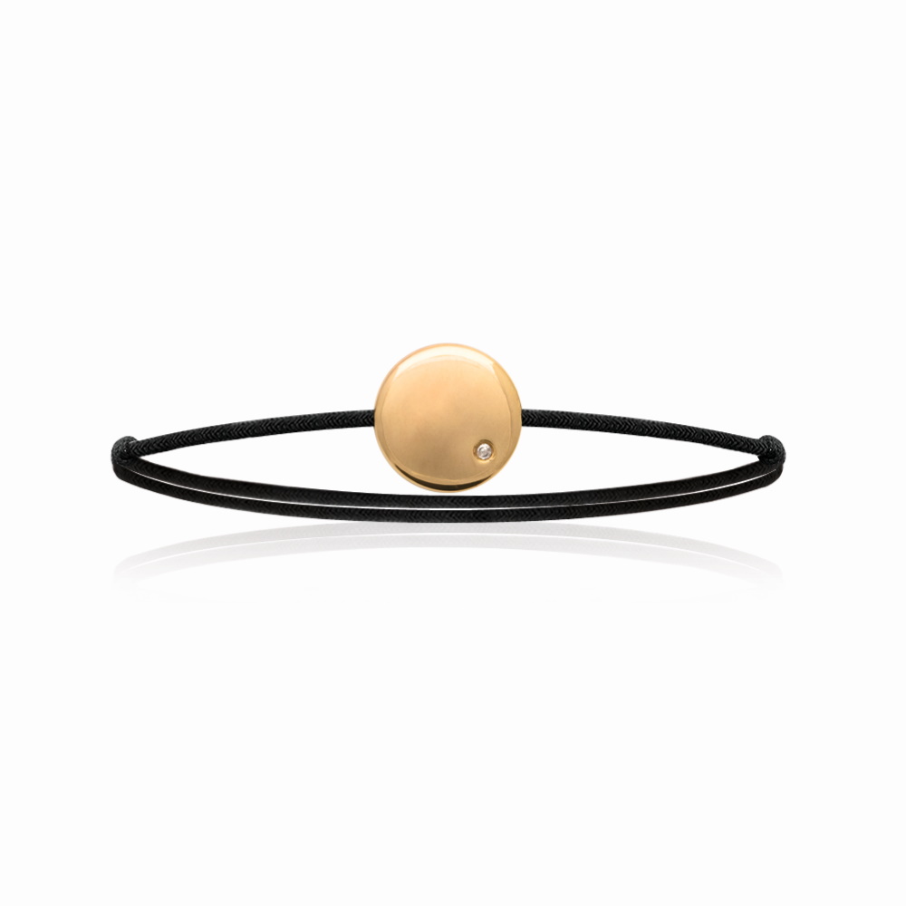 Bracelet composé d'un cordon en coton et d'une pastille ronde en plaqué or jaune 18 carats sertie d'une pierre d'imitation diamant.